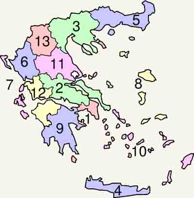 1- آتیک 2- یونان مرکزی 3- مقدونیه مرکزی 4- کرت 5- مقدونیه شرقی و ترکیه 6- اپیروس 7- جزایرایونی 8- اژه شمالی 9- پلیونز 10- اژه جنوبی 11- تسالی 12- یونان غربی 13- مقدونیه غربی |