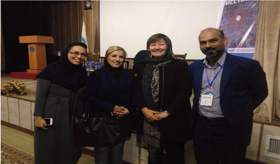 از راست: آقای دکتر امیر زارعیان جهرمی، مدیر و صاحب امتیاز موسسه؛ خانم دکتر یولیا کراخت Julia Kracht، مدیر دفتر امور اجرایی DAAD و هماهنگ کننده همایش زبان آلمانی