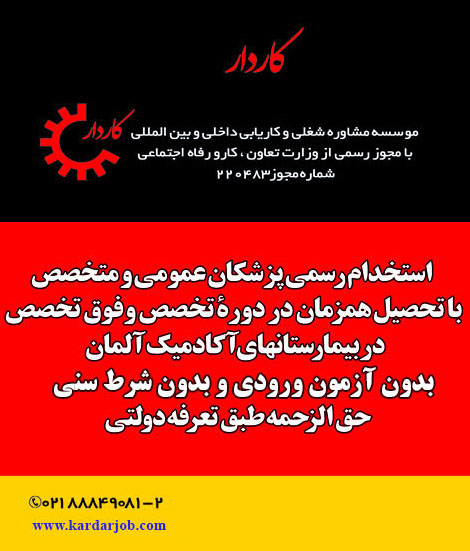 - - مؤسسۀ کاریابی بین المللی کاردار از جمله، از 11 سال پیش، زیر نظر وزارت تعاون، کار و رفاه اجتماعی، با بهره گیری از دانش روز دنیا توانسته است، ضمن درک درست و واقع بینانه، همچنین با شناخت بازار کار آلمان و با بهره گیری از کادری مجرب و آموزش دیده، بسیاری از متقاضیان و جویندگان کار را به کشور آلمان اعزام نماید.